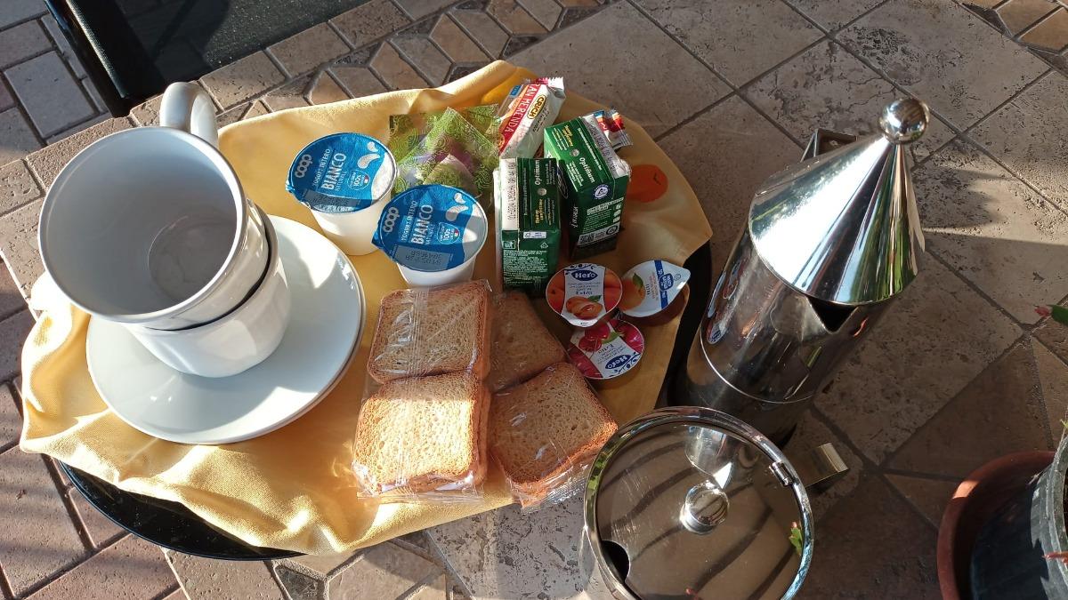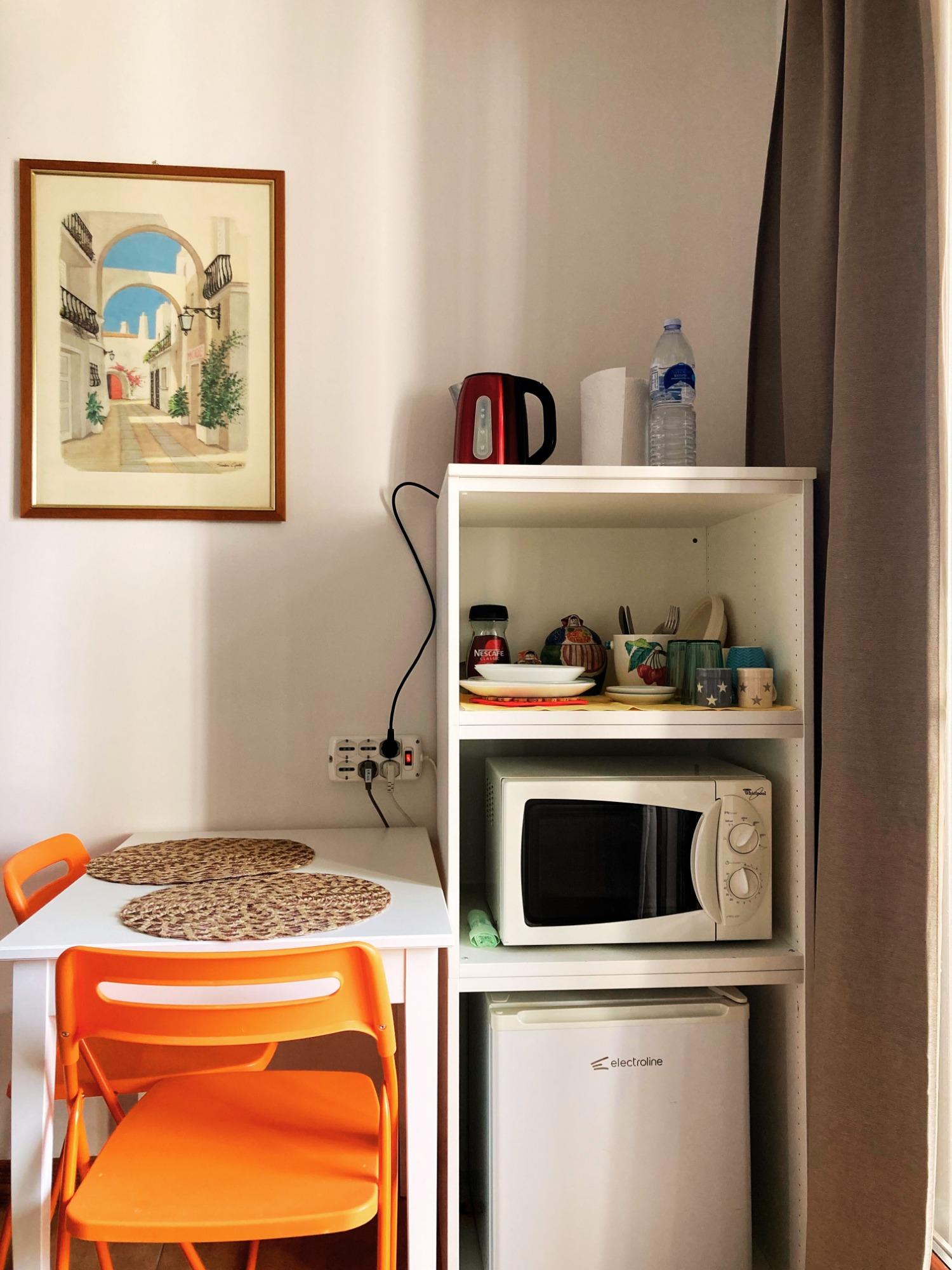 The rooms are equipped for the independent management of breakfast with cups, plates, glasses, refrigerator, kettle, coffee maker, microwave oven.